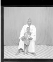 89. EAP449/2/9/89 Reference (shelfmark): EAP449/2/9/89 Title: A man wearing a large boubou sitting face-forward and a child standing face-forward in front in the studio. Collection Area: Endangered Archives Programme Languages: Not applicable Date Range: 2nd half od the 20th century Extent: 1 TIFF image