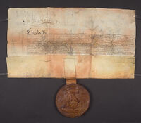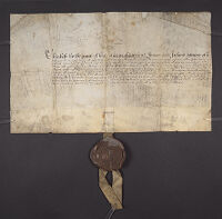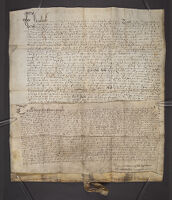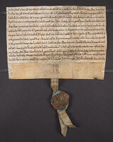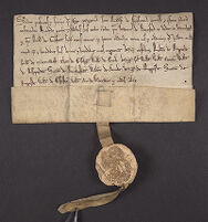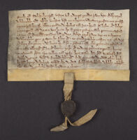 - Quitclaim by Emma, once the wife of William Mustel of Tirigt[ona], to Bullington priory [Lincolnshire], of all the lands which William held. Endorsed: in an early 13th-century hand, ‘Confirmacio Emme relicte / W[illelmo] Mustel i[n] viduitate sua / de t[er]ris in Tirigt[ona].’ Affixed with a s...