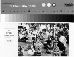 Morning alms giving ceremony in Hongsa District, Sayabouli Province in 1990s, heads by Sathou Nyai Khamchan Virachitta Mahathera, Abbot of Vat Saen Sukharam and participate by monks from Luang Prabang. Original material consists of: chromogenic print