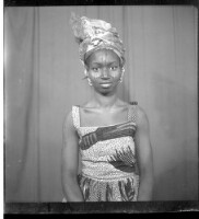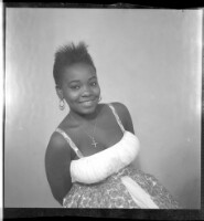 - A young girl sitting in profile in the studio wearing a dress, a cross necklace, and two earrings, smiling with her hands behind her back and
