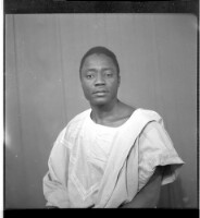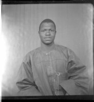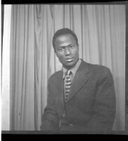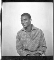 - A young man sitting facing forward in the studio wearing a black short sleeved dress shirt.