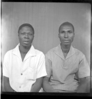 - Two men sitting facing forward in the studio, one wearing a white dress shirt and the other wearing a black dress shirt.