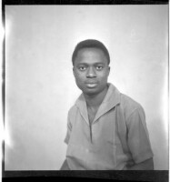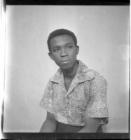 - A young man sitting in profile in the studio wearing a short sleeved dress shirt with two pockets.