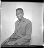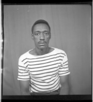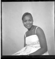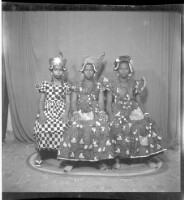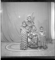 A woman sitting in a chair with three children in the studio. She wears a une camisole, a necklace, ""tourekalla,"" a Fulani hairstyle, and two earrings. She is holding a baby on her knees, a little girl on her right wears a dress and a little girl on her