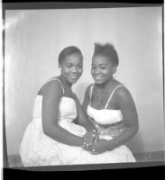 Two young girls sitting in the studio, the one on the right wearing a white dress, earrings, and smiling with her arms crossed. The girl on the left wearing a white dress, hairstyle, earrings, necklace, and smiling.
