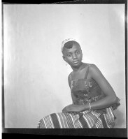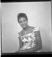 A young girl sitting in the studio wearing a dress, a necklace, earrings, a hairstyle, a watch, and smiling.