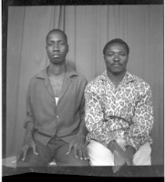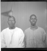 Two men sitting facing forward in the studio, one wearing a white boubou and the other wearing a black boubou.