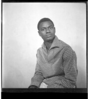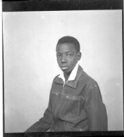 A young man sitting in a chair facing forward in the studio wearing a black long sleeved track jacket.
