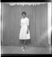 A young girl standing in the studio wearing a white long sleeved dress, a watch, white earrings, a hairstyle, and white shoes.