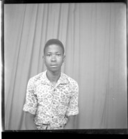 A young man sitting in a chair in the studio wearing a long sleeved dress shirt.