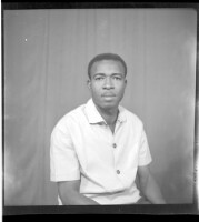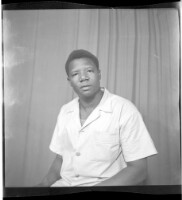 A man sitting in a chair facing forward in the studio wearing a short sleeved shirt with two buttons.