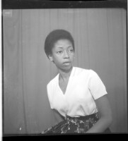 A young girl in the studio wearing a white shirt and black skirt with an afro.
