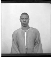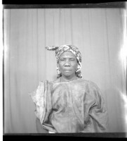 An old woman sitting facing forward in the studio wearing a boubou and a headscarf.