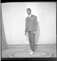 A man standing on a rug in the studio wearing a suit and tie and white shoes.