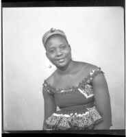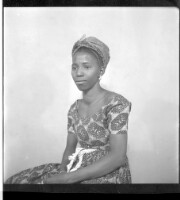 A woman sitting in profile in the studio wearing a une camisole, a pagne, a headscarf, and earrings.