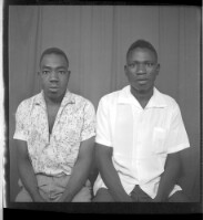 A couple sitting facing forward in the studio, a woman wearing a une camisole, pagne, and headscarf, held by a man wearing a long sleeved dress shirt and a watch.