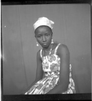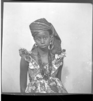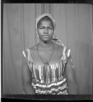- A woman wearing a dress, headscarf, and necklace facing forward in the studio.