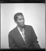 - A man sitting in profile in the studio wearing a dress shirt and black suit.