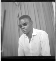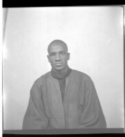 - A man sitting facing forward in the studio wearing a black boubou.