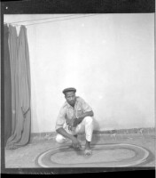 - A man crouching facing forward in the studio wearing a dress shirt, pants, and a hat.