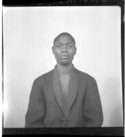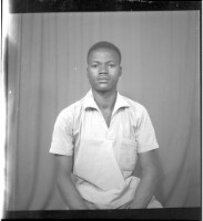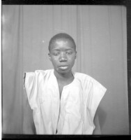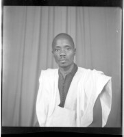 - A man sitting facing forward in the studio wearing a black t-shirt and white boubou.