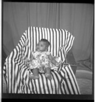 - A baby laying on a pagne in a chair facing forward in the studio.
