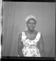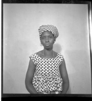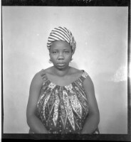 - A woman wearing a dress and a headscarf facing forward in the studio.