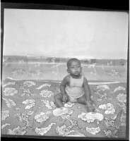 - A baby wearing a jumpsuit sitting facing forward on a pagne on the ground in the studio.