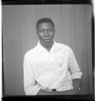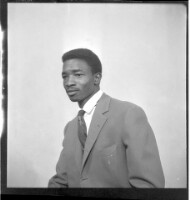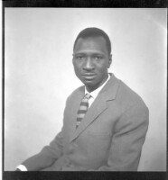 - A man sitting facing forward in the studio wearing a white shirt, suit, and tie.