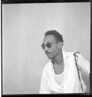 - A man sitting in profile in the studio wearing a white shirt and sunglasses.