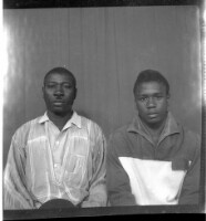 - A couple, a man wearing a white shirt and suit and tie sitting facing forward, and a woman wearing a dress sitting facing forward in the studio.