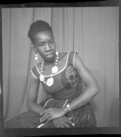 - A girl wearing a dress and necklace sitting in profile in the studio.