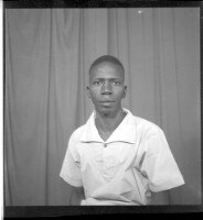 - A man wearing a white shirt, black suit, and tie sitting in profile in the studio.
