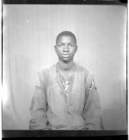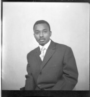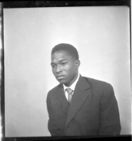 - A man sitting facing forward in the studio wearing a white shirt, black suit, and tie.