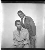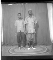 - Two men wearing dress shirts, one with a hat, standing facing forward in the studio.