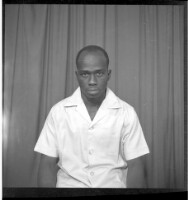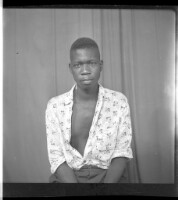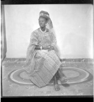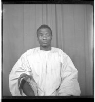 - A man wearing a large white boubou sitting facing forward in the studio.