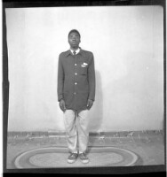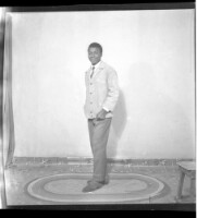 - A man wearing a white dress shirt, suit, and tie, standing in profile in the studio.