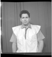 A man wearing a white short sleeved shirt sitting facing forward in the studio.