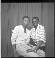 Two men with their arms on each other, one wearing a shirt and sunglasses with a cigarette, standing in profile, and the other wearing a white shirt sitting facing forward in the studio.