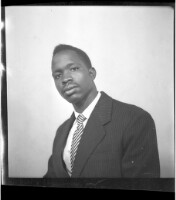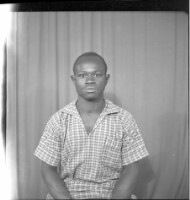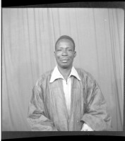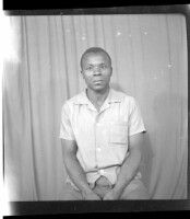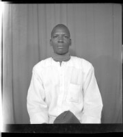 A man wearing a dress shirt and a boubou sitting facing forward in the studio.