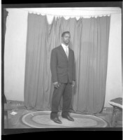 A man wearing a white shirt, black suit, and tie standing in profile in the studio.
