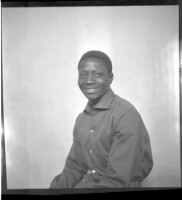 - A man wearing a white short sleeved dress shirt sitting in profile in the studio.
