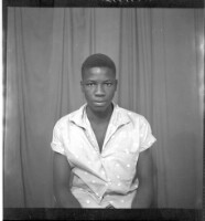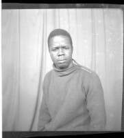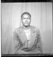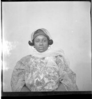 - A woman wearing a pagne and headscarf sitting facing forward in the studio.