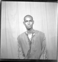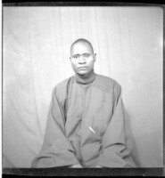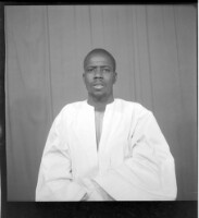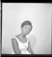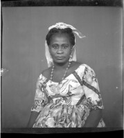 A woman wearing a white dress, her hair done, a necklace, a white headscarf, and earrings facing forward in the studio.