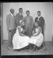 Six young people, two women sitting in chairs, one wearing a white dress, white headscarf and earrings, the other wearing a white dress, earrings, and a hairstyle. Four men standing behind them, one wearing a suit and tie, glasses and a Fez, next to a ma