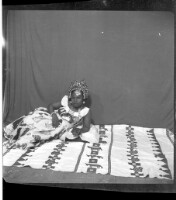 A woman laying on a traditional dara wearing a dress, a necklace, a headscarf, and earrings in the studio.
