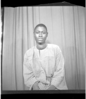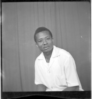 A young man sitting facing forward wearing a short sleeved shirt in the studio.