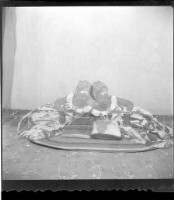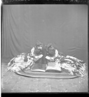 Two women laying on a rug, both wearing dresses, necklaces, headscarves, and earrings in the studio.
