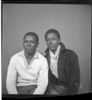 Two young men sitting facing forward in the studio, one wearing a white long sleeved shirt, the other wearing a dress shirt and black long sleeved jacket.
