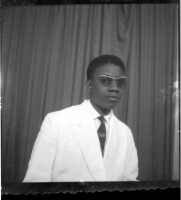 A man wearing a white shirt, white suit, and sunglasses sitting in profile in the studio.